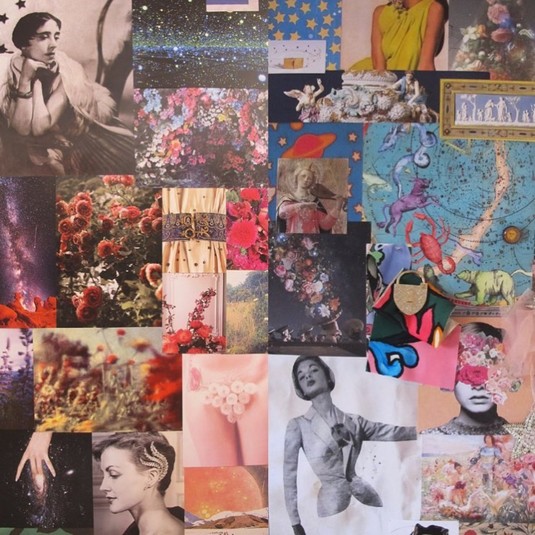 В мудборде Гийона кроме всевозможных садов, полей и розариев также можно рассмотреть старинные зодиакальные карты, фотографии самой Эльзы Скьяпарелли и винтажные фотографии моделей в жакетах с подчеркнуто узкими талиями.