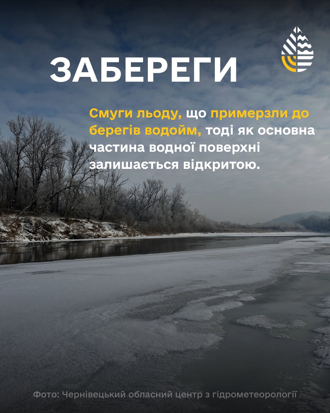 Також на берегах водойм утворюються «забереги» – смуги льоду, що примерзають до берегової лінії, тоді як основна частина водної поверхні залишається відкритою.