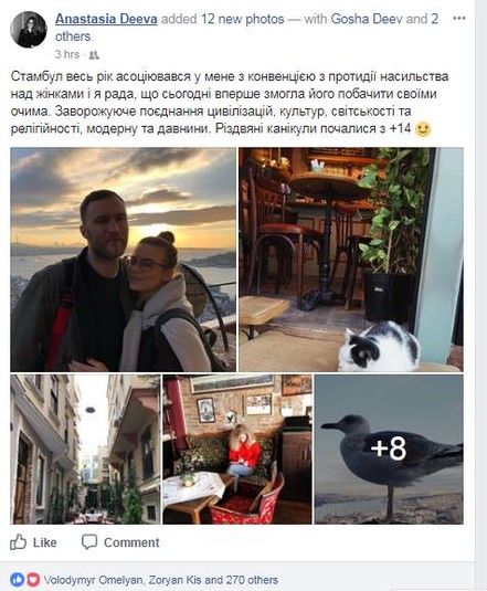 В свою очередь сама Деева сегодня опубликовала ряд снимков со своими прогулками по столице Турции. «Стамбул весь год ассоциировался у меня с конвенцией по противодействию насильству над женщинами и я рада, что сегодня впервые смогла увидеть его своими глазами. Завораживающее сочетание цивилизаций, культур, светскости и религиозности, модерна и старины. Рождественские каникулы начались с +14», - подписала снимки бывшая заместительница министра.