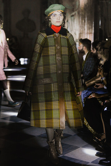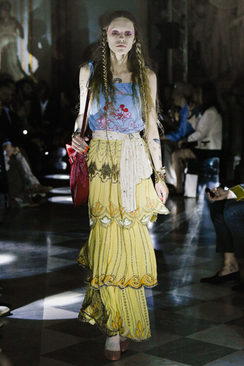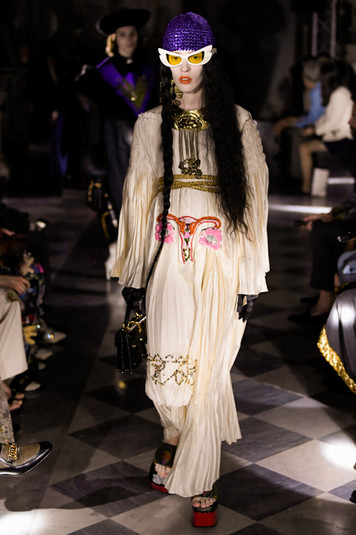 Изначально весь антураж соответствовал типичной для креативного директора Gucci эстетике, которая часто пронизывает столетия, а иногда даже тысячелетия истории и искусства. Но это шоу стало поворотным моментом для Микеле и своего рода сборником всевозможных цитат – от поэзии Уильяма Блейка до трактатов профессора Донны Харауэй.