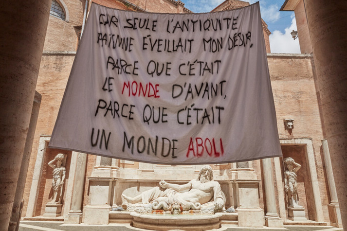 На огромном полотне, развешанном у входа в Капитолийские музеи, Алессандро Микеле процитировал французского историка и археолога Поля Вена.