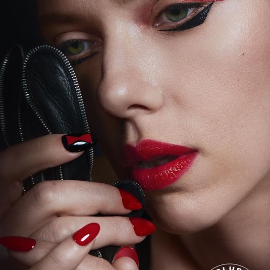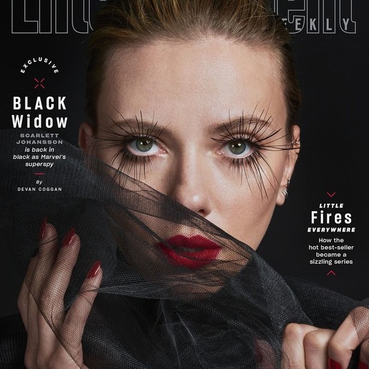 Американская актриса Скарлетт Йоханссон украсила обложку глянца. Она показала дерзкие аутфиты в стиле total black. Визажисты придумали героине Entertainment Weekly оригинальный look. Они использовали экстремально длинные ресницы, чтобы создать драматический образ. «Паучьи глаза» дополнили алая помада и маникюр в тон. Волосы кинодива убрала назад.