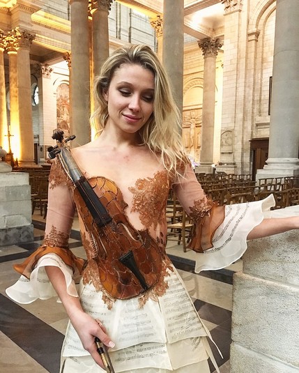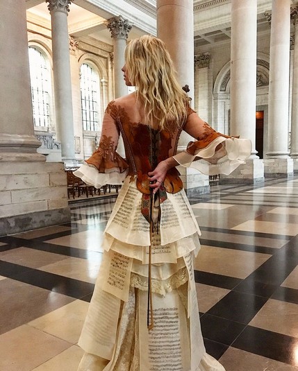 Например, платье под названием «Дань книгам» изготовлен из старых книжных корешков. На его создание девушка потратила 250 часов. А в платье «Дань музыке» можно разглядеть не только скрипку, но и листы с нотами.