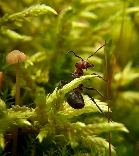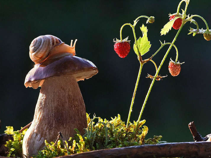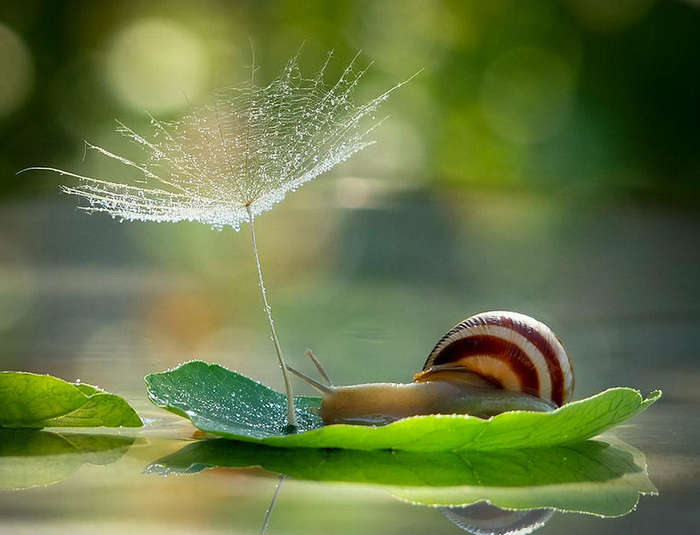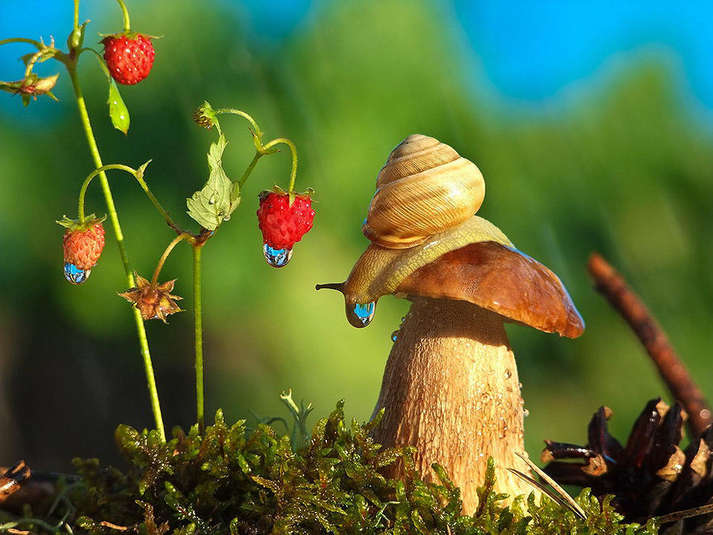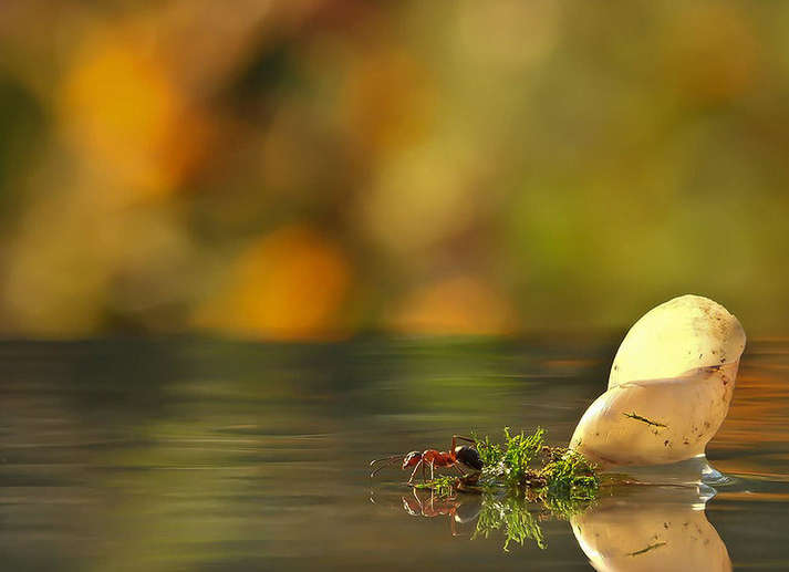 Его снимки словно иллюстрации к доброй детской книжке про насекомых, в которой забавные улитки и смелые муравьи исследуют лесные просторы, покоряя огромные для них грибы и осмеливаясь смотреть на собственное отражение в речках и озерах.