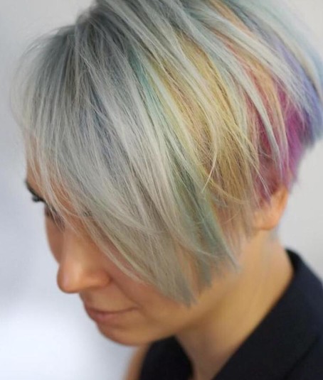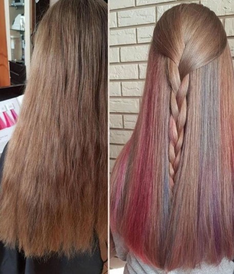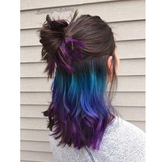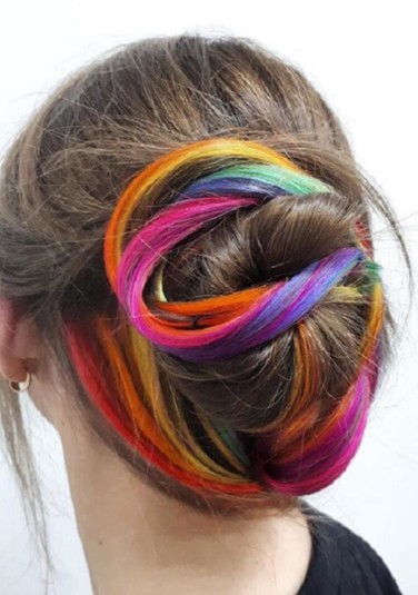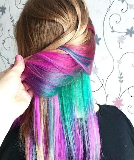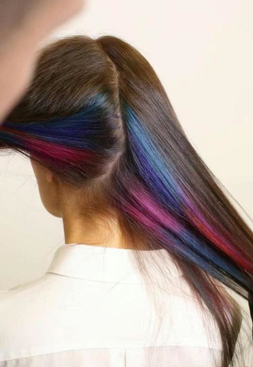 Эффектные переливы синего, розового, зеленого, красного, оранжевого или фиолетового оттенков, спрятанные под массивом остальных волос, выглядят впечатляюще. Они становятся заметны в заплетенных косичках или при дуновении ветра.