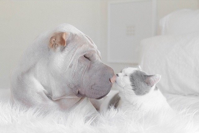 Паддингтон породы шарпей и белый кот Батлер