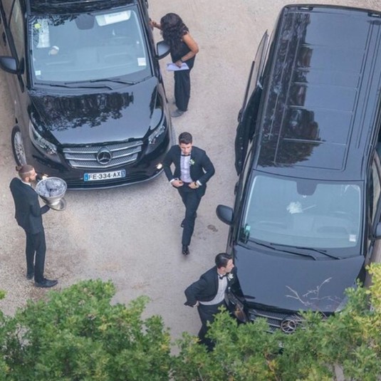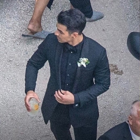 В Сети уже появились первые снимки со свадьбы пары. Невеста выбрала платье и фату Louis Vuitton. Жених не стал отказываться от классики: Джо надел черный костюм и рубашку в тон. Он ждал возлюбленную у алтаря вместе с щенком породы Хаски.