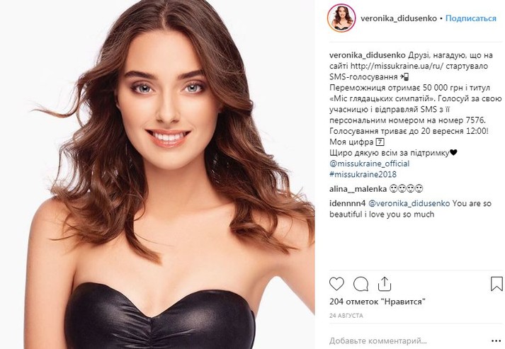 Победительницей конкурса стала 23-летняя модель, математик и полиглот Вероника Дидусенко,которая выступала под номером 7. Ее выбрали среди 25 самых красивых девушек из всех регионов страны.