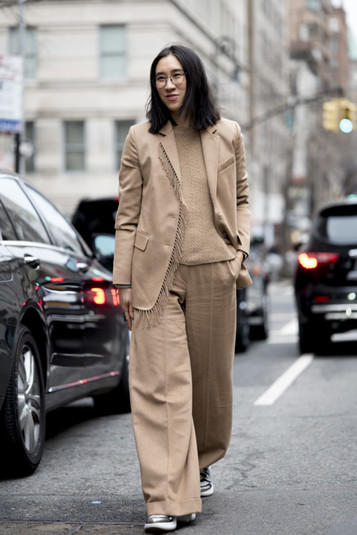 Пока главный стритстайл-тренд на улицах города – одежда всех оттенков бежевого. Девушки носят и костюмы в песочной гамме.