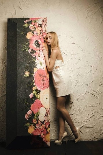 Модели позируют рядом с картонными гробами, украшенными самыми разнообразными рисунками
