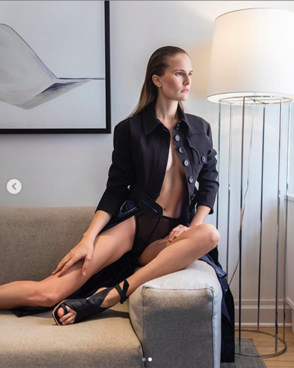 На первой фотографии супермодель позирует в красивом черном платье с кожаным поясом на талии. Она запечатлена в экстравагантной позе и не смотрит в камеру. На второй фото Алла появилась в уже более раскованном образе, на ней черные трусики и голый торс, который она прикрыла плащом на пуговицах. Здесь модель также не смотрит в камеру, она сидит на диване в грациозной позиции.