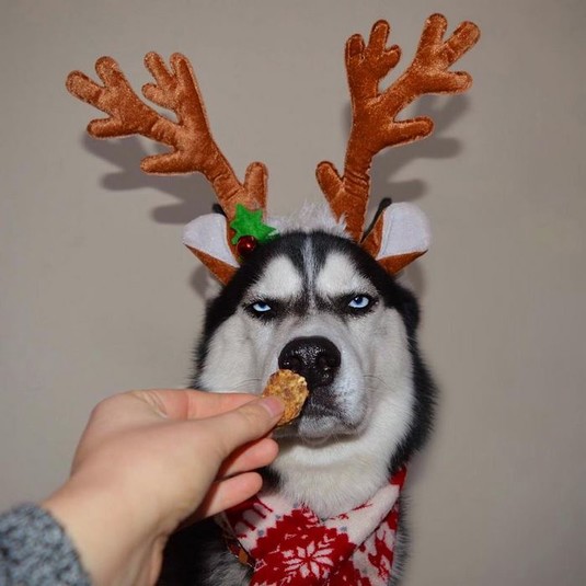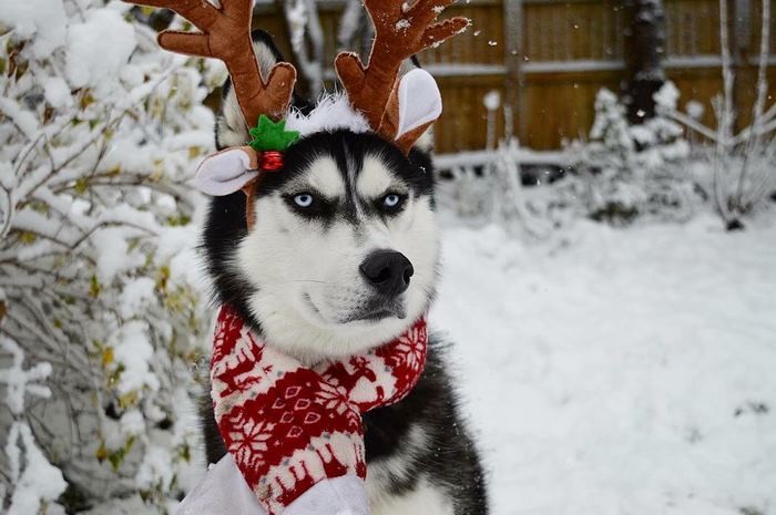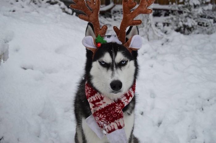 Девушка по имени Жасмин нарядила своего строгого пса породы хаски к Рождеству в костюм оленя. На животное по кличке Ануко надели рожки и повязали на шее праздничный шарфик. Однако настроение у самой собаки от того, очевидно, лишь ухудшилось.