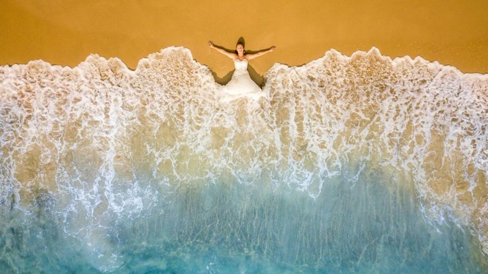 «Когда я увидел ее идущей по берегу, то заметил, что ее платье того же цвета, что и морская пена. Поэтому я сразу решил, что она должна лежать в прибое», - рассказал фотограф.