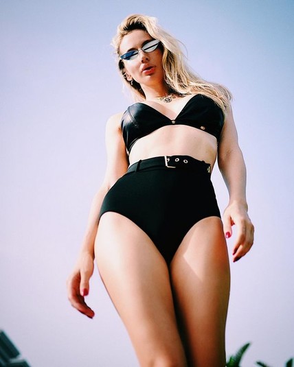 Знаменитость выставила пикантный кадр в черном кожаном бикини, примерив плавки с поясом и завышенной талией.