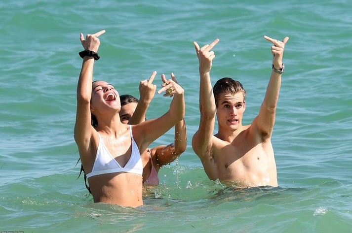 Папарацци сфотографировали Пресли, когда он купался с незнакомками в океане. Веселая компания постоянно о чем-то беседовала, и особенно мило Гербер ворковал с блондинкой. В какой-то момент молодой человек даже приобнял девушку.
