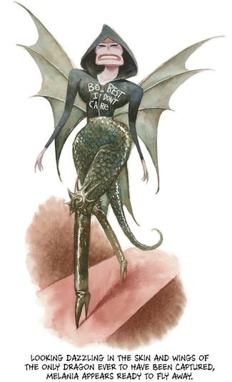 Редакторы решили, что Меланья напоминает им дракона. Они нарисовали первую леди с чешуей и крыльями и слишком «натянутой» улыбкой. Экс-модель шагает на высоченных каблуках в толстовке с надписью Be Best I Dont Care, что является отсылкой к ее кампании в поддержку детей, которые сталкиваются с буллингом в соцсетях. «Выглядит великолепно в драконьем образе с крыльями — Меланья, которая готова улететь куда подальше», — подписали картинку журналисты.