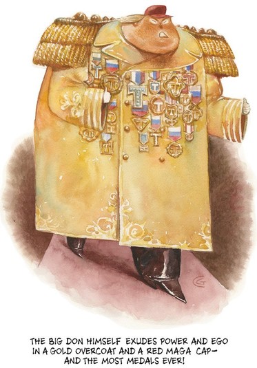 Дональда Трампа показали в образе генерала, который имеет всевозможные медали. 45-президент США носит золотой плащ, усеянный наградами. «Big Don прощает себе силу и эгоцентричность в золотом плаще и красной кепке — и, конечно же, имеет больше всех наград». Кстати, красная кепка — отсылка к кампании Дональда с лозунгом Make America Great Again.