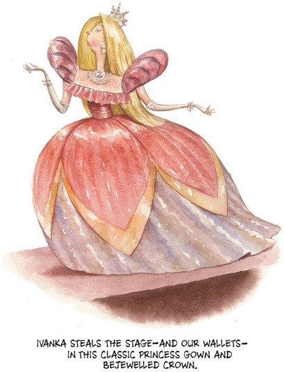 Иванка в пышном розовом платье представлена надменной принцессой. Впрочем, на картинке и надпись соответствующая — «Иванка обратила на себя все внимание и разорила наши кошельки. Поступает в духе классической принцессы с короной, усыпанной драгоценностями».