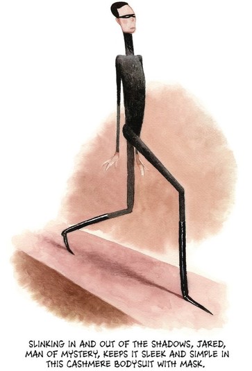 Муж Иванки — Джаред изображен таинственным незнакомцем в очках и черном костюме. На картинке он будто идет на цыпочках, боясь поднять шум. «Изворотливый и скользкий Джаред, пора выходить из теней — в этом кашемировом комбинезоне и черных очках тебе, конечно, проще».
