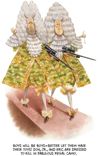 Сыновья Трампа — Эрик и Дональд-младший выглядят, как пажи. Правда, на их нарядах хаки-принт, а в руках автоматы: «Мальчики есть мальчики. Эрик и Дональд одеты в роскошный царственный камуфляж и готовы убивать».