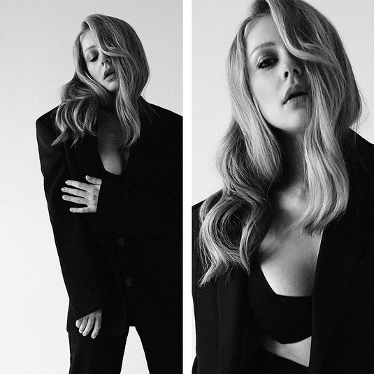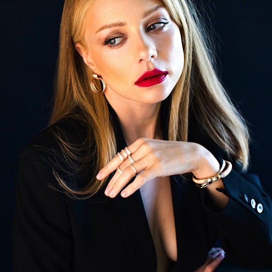 Исполнительница позирует в черном жакете, показывая новые золотые украшения - изящные браслеты, серьги и кольца. Волосы Кароль аккуратно уложены, макияж сделан с акцентом на красные губы. Кароль загадочно смотрит куда-то в сторону.