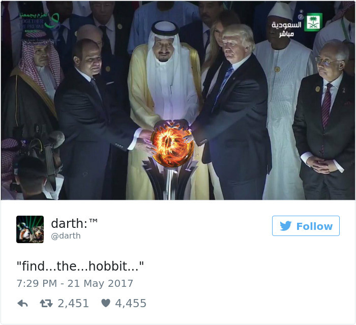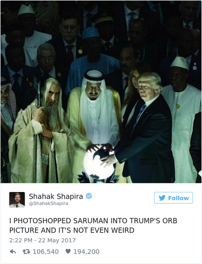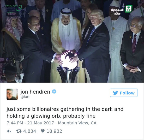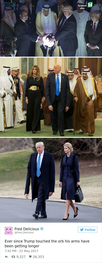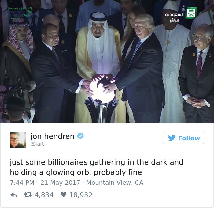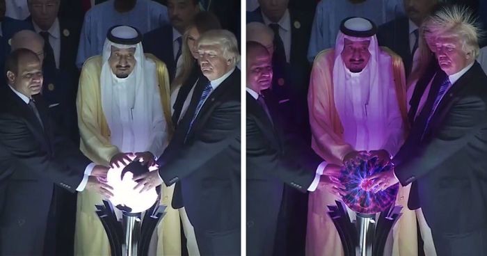 Президент США Дональд Трамп посетил арабо-американский саммит, который открылся 21 мая в Эр-Рияде. Вместе с президентом Египта и королем Саудовской Аравии Трамп сфотографировался, положив руки на светящийся глобус.