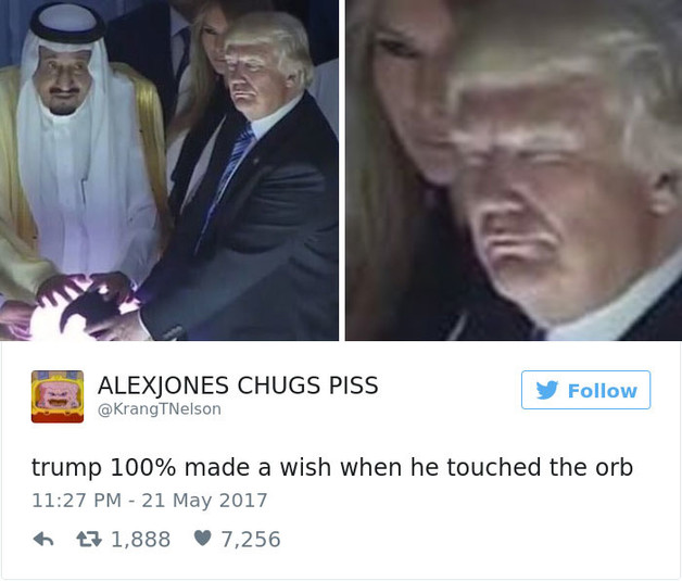 Вообще этот жест призван символизировать совместную борьбу с терроризмом, сообщает Guardian. Но, глядя на довольно прикрывшего глаза Трампа, пользователи соцсетей начали подозревать, что здесь что-то не так.