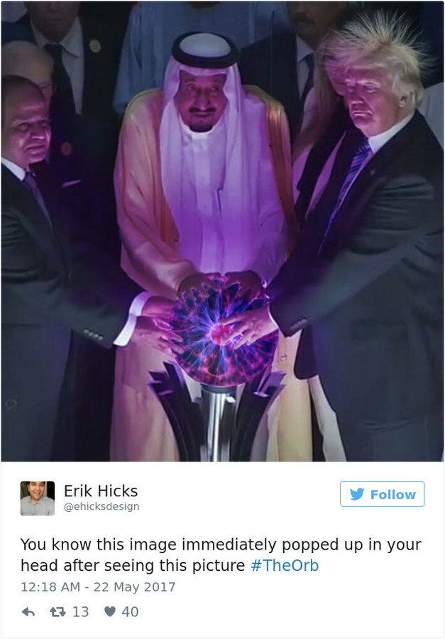 Теперь в интернете гадают, что мог значить этот довольно странный жест. На ставшей вирусной фотографии Дональд Трамп, Абдул-Фаттах Ас-Сиси и король Салман ибн Абдул-Азиз Аль Сауд стоят у светящегося глобуса, положив на него руки.