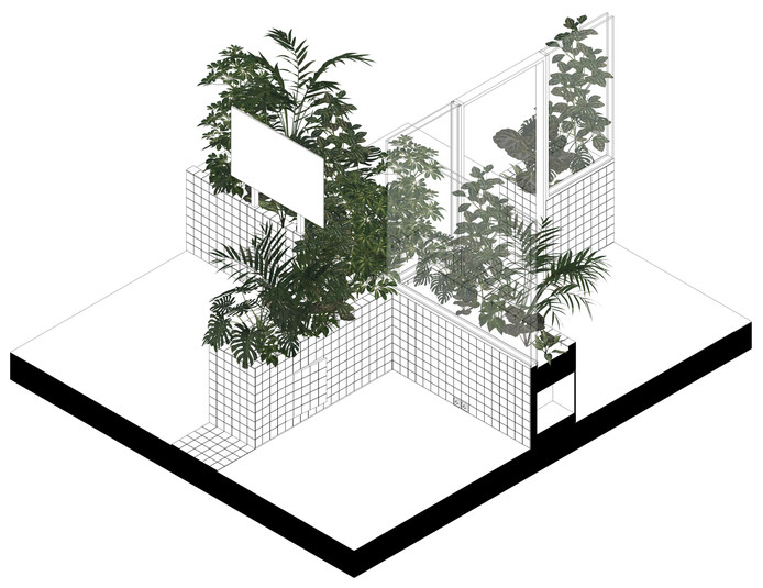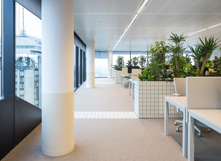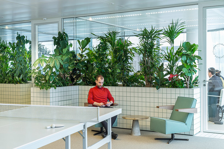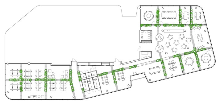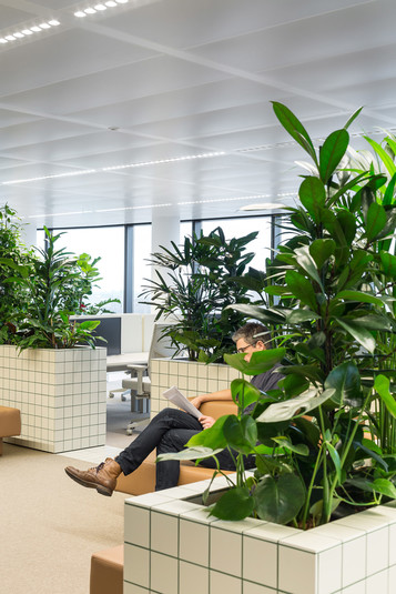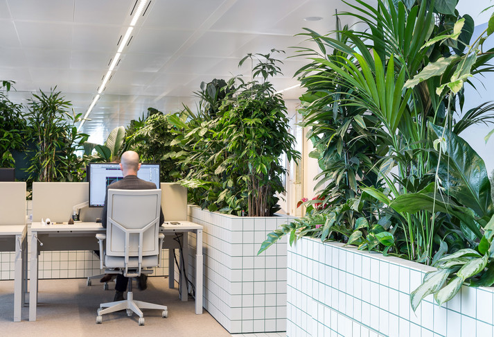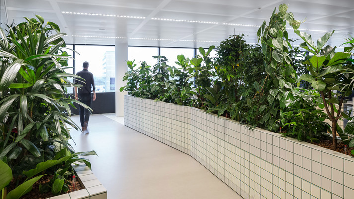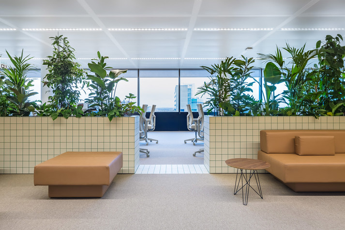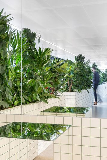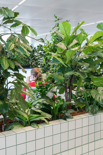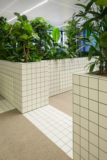 Офис зонировали с помощью стен высотой один метр. Их облицевали белой плиткой с зелеными швами. Внутри стены наполнены почвой, в которые высадили более 750 тропических растений. Таким образом растения формируют живую изгородь между работниками различных отделов компании.