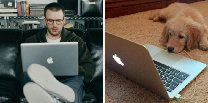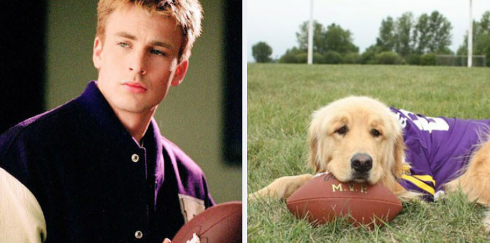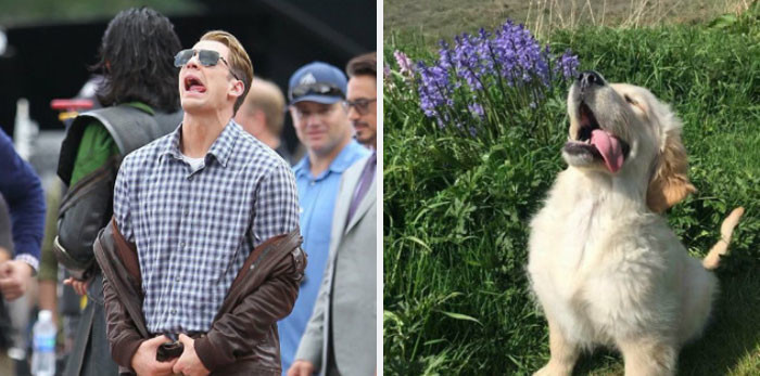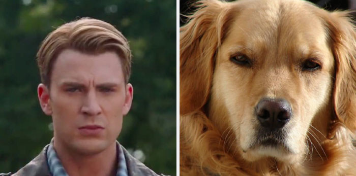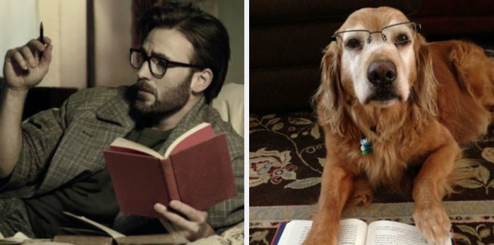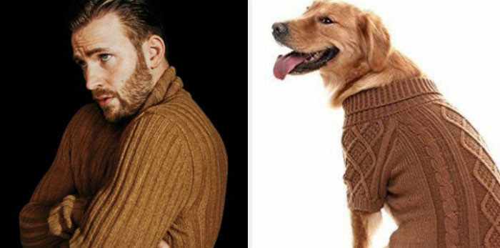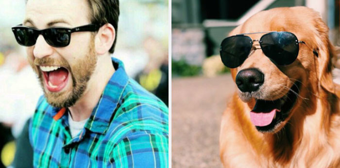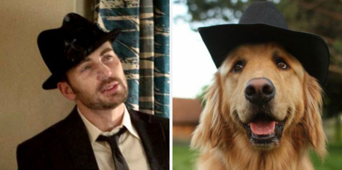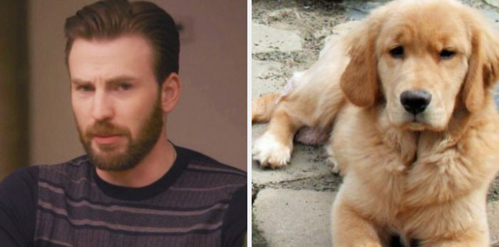 А иногда и люди так походят на собак, что можно убедиться: они явно были песелями в прошлой жизни или же их превратил в человека злой колдун. По крайней мере, так можно решить, просмотрев новый аккаунт в твиттере, посвящённый Крису Эвансу.