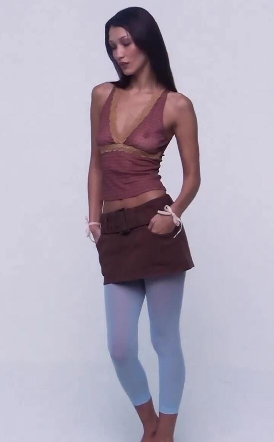 Белла приміряла всі образи, але серед них виявився предмет одягу, без перебільшення несумісний із реальним життям. Бордовий і повністю просвічуючий топ модель продемонструвала без бюстгальтера.