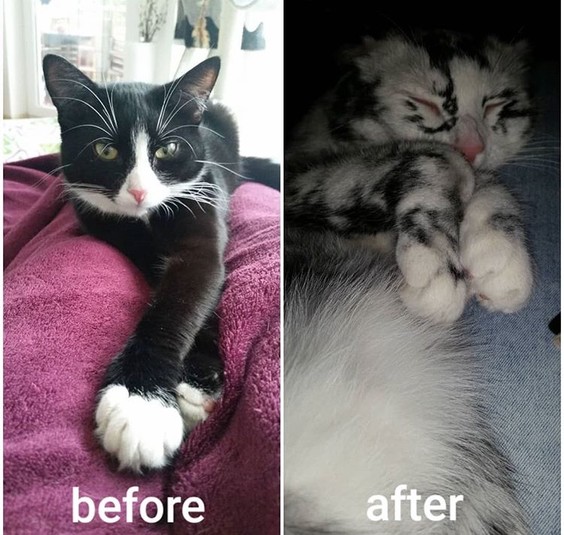Как поведала Николь, она обнаружила двух котят на заброшенной ферме в 2016 году. Женщина унесла их к себе домой. Однако в 2017 году у одной из кошек по имени Элли в шерсти начали возникать белые пятна. Спустя еще практически год черная шерсть кошки полностью окрасилась в белый.