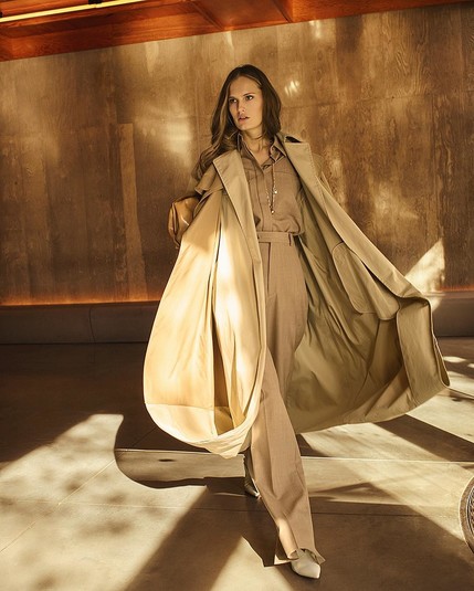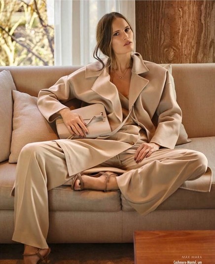 Для этих снимков девушка выбрала наряды песочного цвета, которые прекрасно гармонировали на фоне бежевой мебели и коричневых стен.