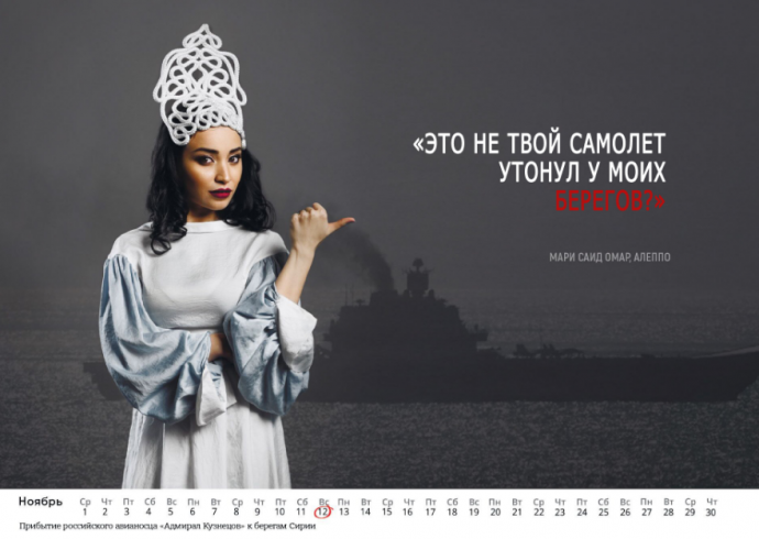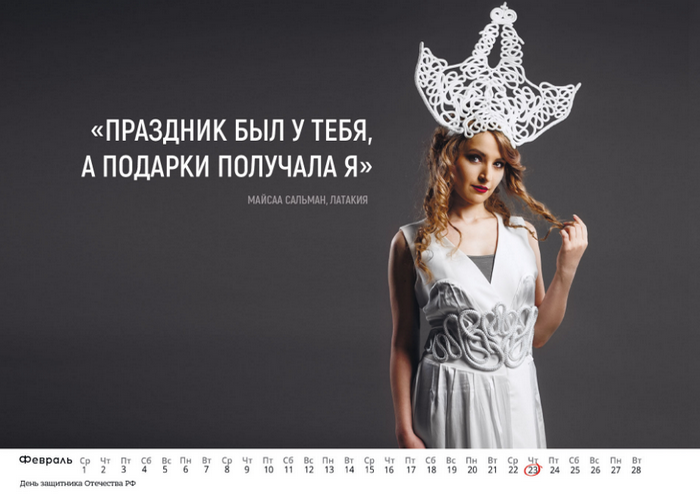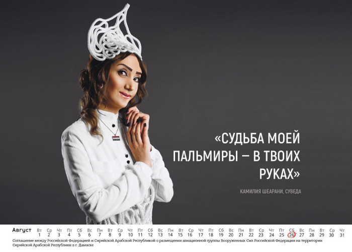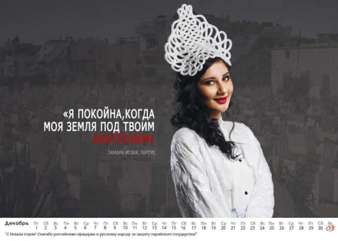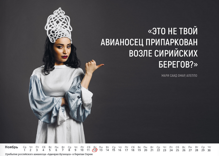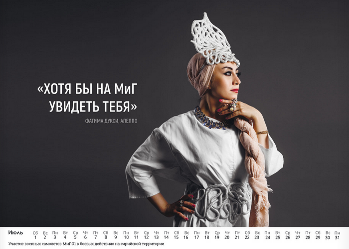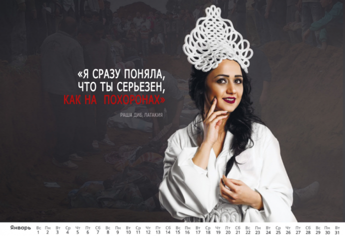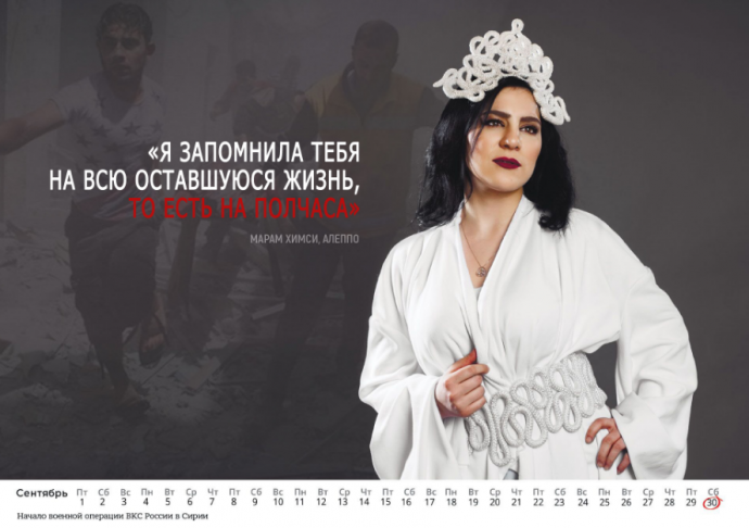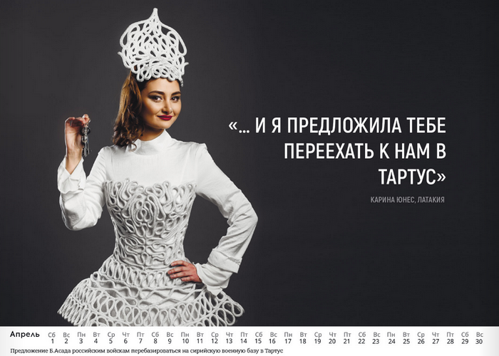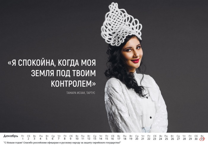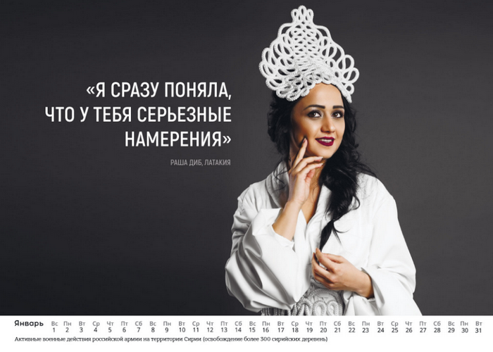 Как сообщают организаторы проекта, 12 сирийских девушек согласились сняться для календаря. На голове у каждой девушки кокошник – «как символ уважения к культуре той страны, которая встала на защиту родного государства». В российской версии календаря каждый месяц отмечен приуроченной к военным действиям РФ в Сирии датой.