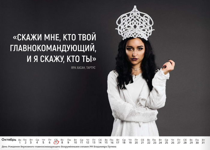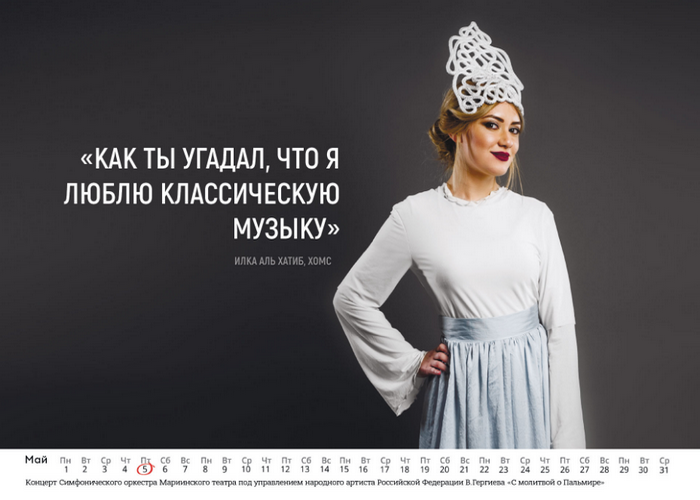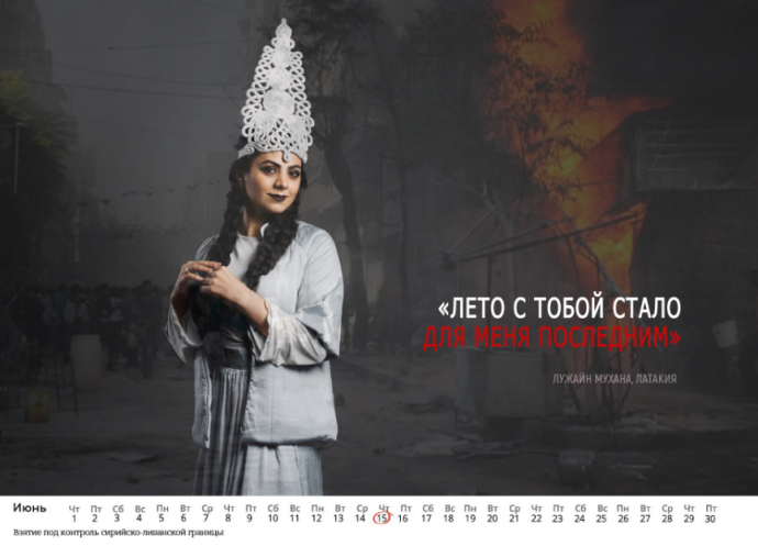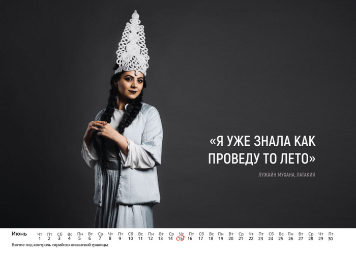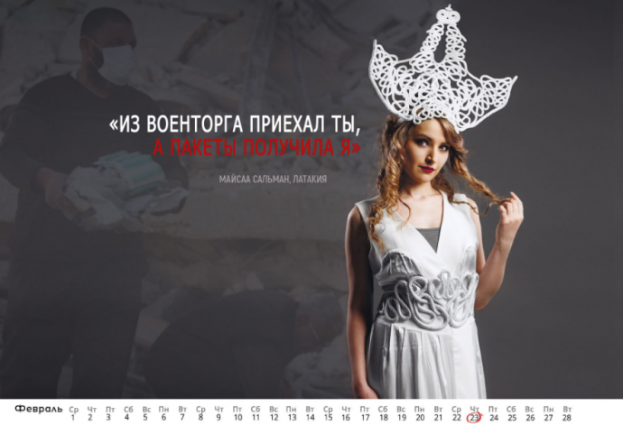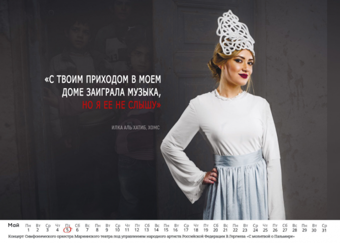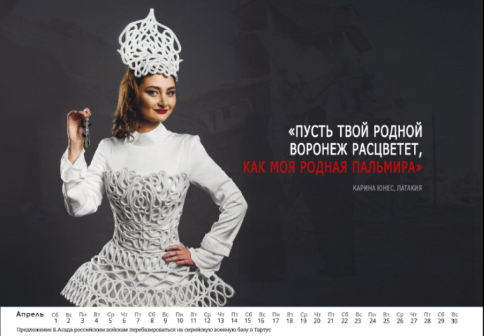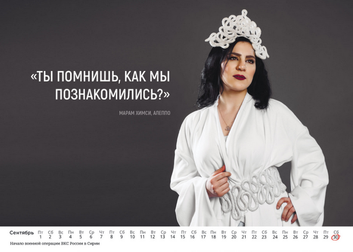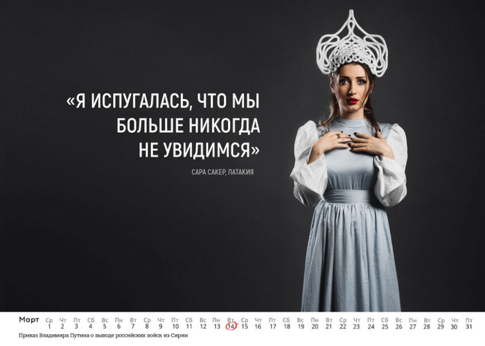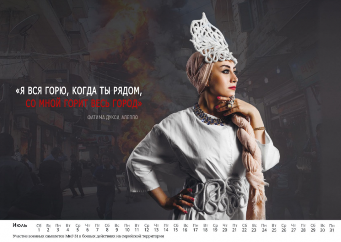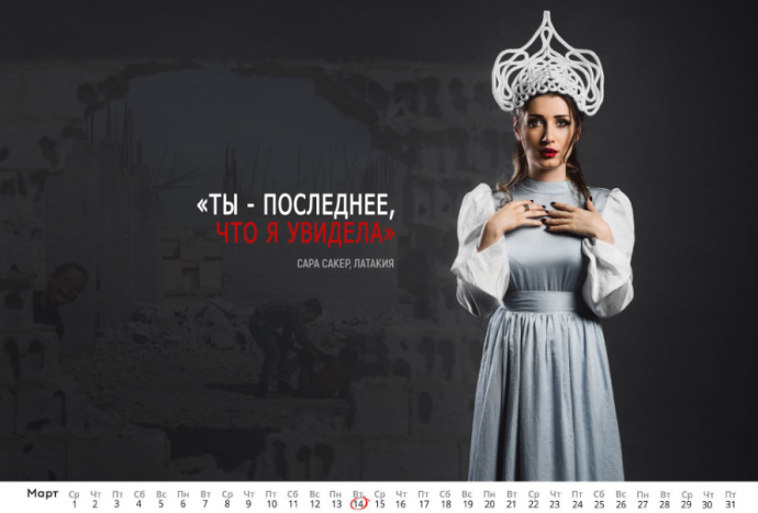 Как сообщают организаторы проекта, 12 сирийских девушек согласились сняться для календаря. На голове у каждой девушки кокошник – «как символ уважения к культуре той страны, которая встала на защиту родного государства». В российской версии календаря каждый месяц отмечен приуроченной к военным действиям РФ в Сирии датой.