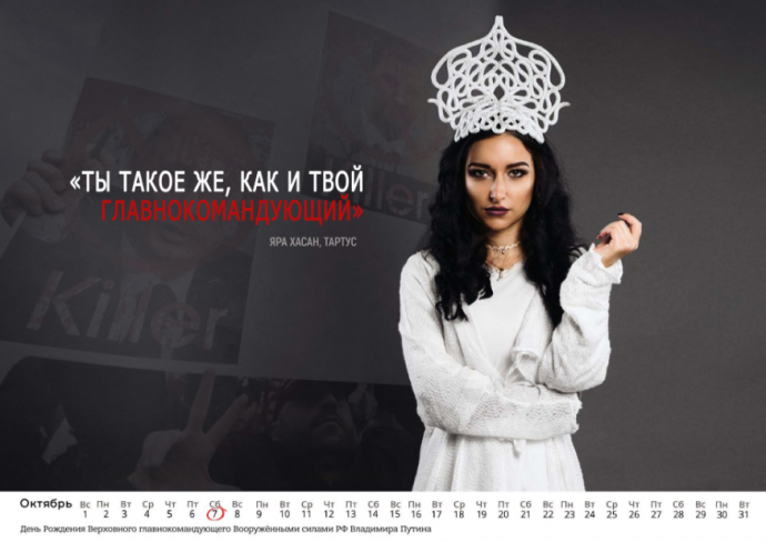 В украинской версии календаря девушки с сирийской внешностью изображены на фоне разрушенных сирийских городов, изображения сопровождают соответствующие подписи красного цвета.