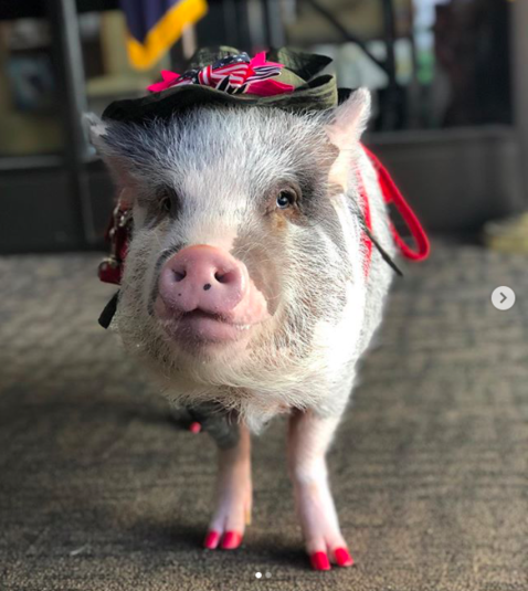 Свинке по имени Лилу 5 лет, ее взяли на работу за спокойствие и умение быть дружелюбной. На каждую рабочую смену Лилу привозит хозяйка Татьяна, которая предварительно красит ей «ногти» и одевает рабочую форму.