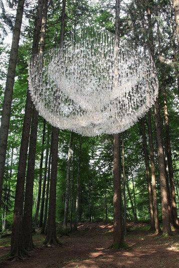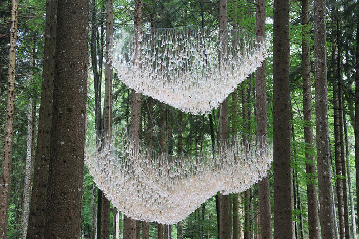 На поляне посреди итальянского леса парит похожая на сверкающую люстру инсталляция, сделанная из тысяч капель дождя