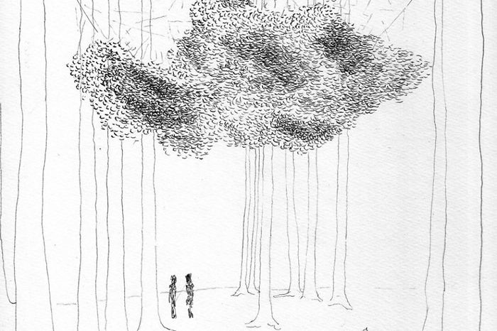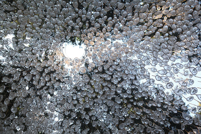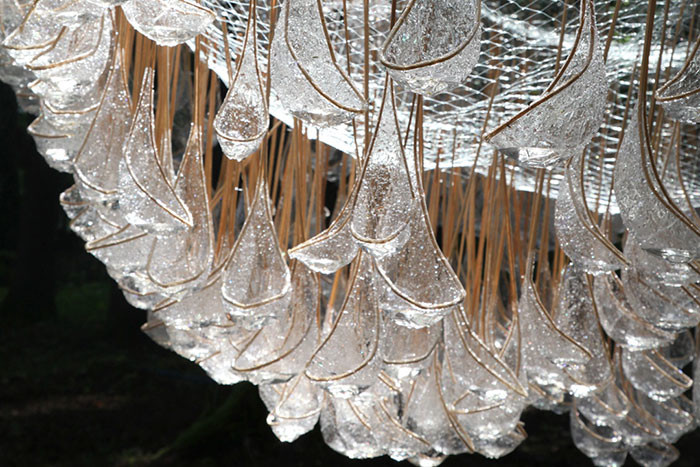 Каждая «капля» прикрепляется к одной из двух прозрачных сеток, подвешенных к верхушкам деревьев. Инсталляция отражает непрерывно трансформирующийся объем. Поскольку дождевая вода или снег накапливается неравномерно, положение и профиль сетей снижаются и смещаются. Когда собранная вода испаряется, форма возвращается к своему первоначальному состоянию.