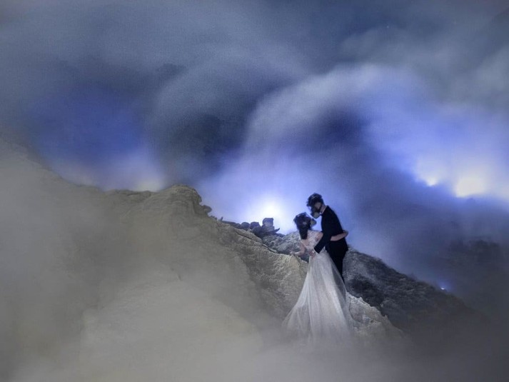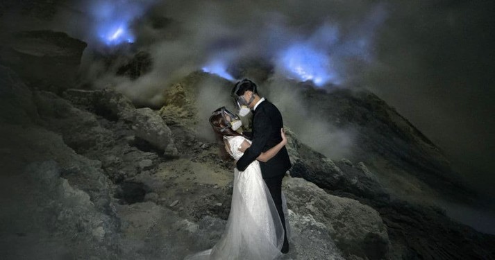 Вот и молодожёны Дэнни Онг и Кристл Ти решили, что им всенепременно нужны фотографии, сделанные в кратере вулкана возле кислотного озера! В этом им помог известный фотограф Кео Ви Лунг, который снял влюбленных возле вулкана Иджен в Индонезии