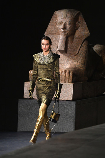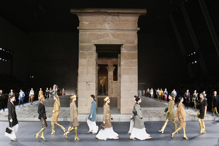 Новую коллекцию Лагерфельд посвятил Древнему Египту, а декорациями для нее выбрал роскошный Храм Дендура, построенный в 10 веке до нашей эры и сейчас находящийся в Нью-Йорке.