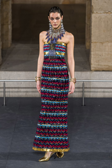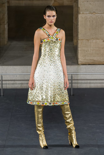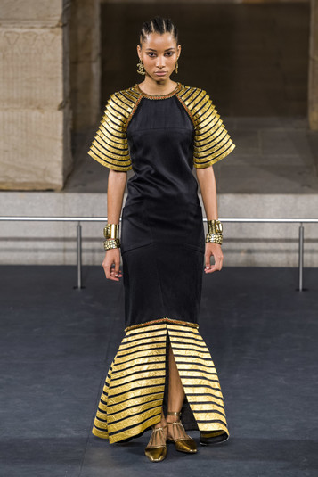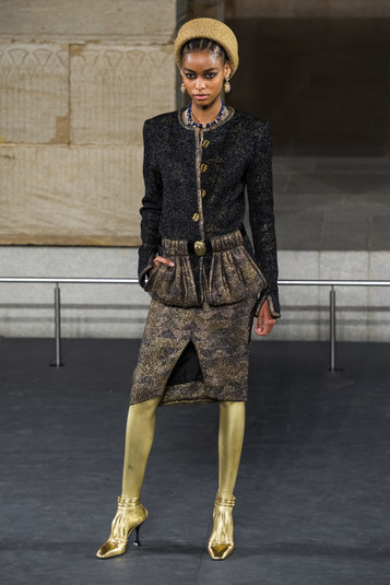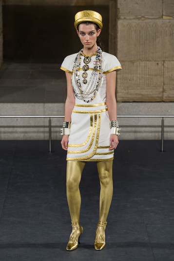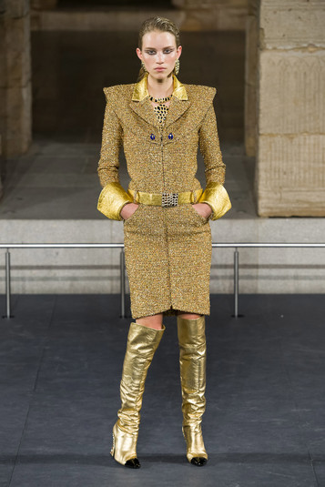 Ключевым в коллекции стал золотой цвет – символ власти и богатства для правителей Древнего Египта. Лагерфельд использовал как чистый его оттенок, так и играл с полутонами. Например, открыли шоу объемные твидовые жакеты в стиле 1980-х, как будто покрытые золотым напылением и затем состаренные.