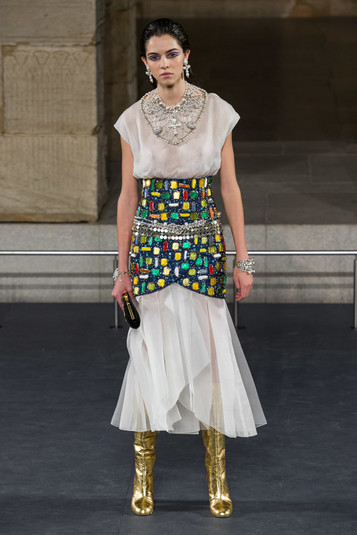 Стилистически Лагерфельду удалось найти баланс между кодами Chanel и элементами древнеегипетского костюма. Так, крой коротких твидовых юбок напоминал о повязках «шендит», белые струящиеся платья в пол отсылали к образу Клеопатры и ее подчиненных, а сложные фактуры, украсившие платья в финале шоу, напоминали о жуках-скарабеях своим блеском и цветовой гаммой.