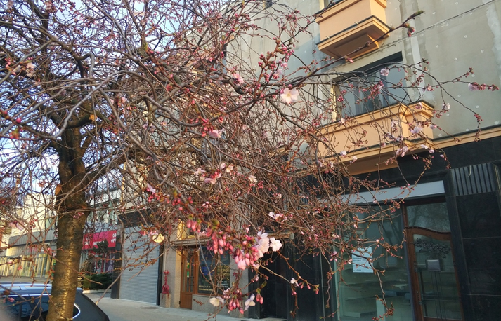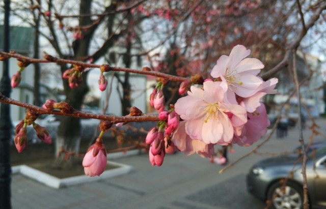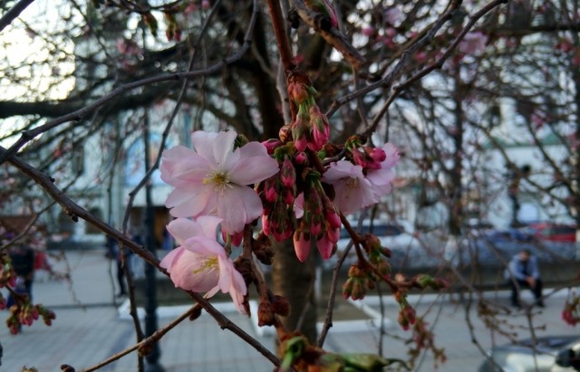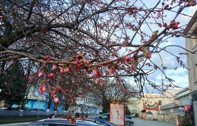 В центре закарпатского города Мукачево расцвели первые в этом году сакуры. Местные жители называют это дерева «безумным», так как оно цветет совершенно непредсказуемо. Дерево может покрыться цветами как в начале апреля, так и в середине мая.
