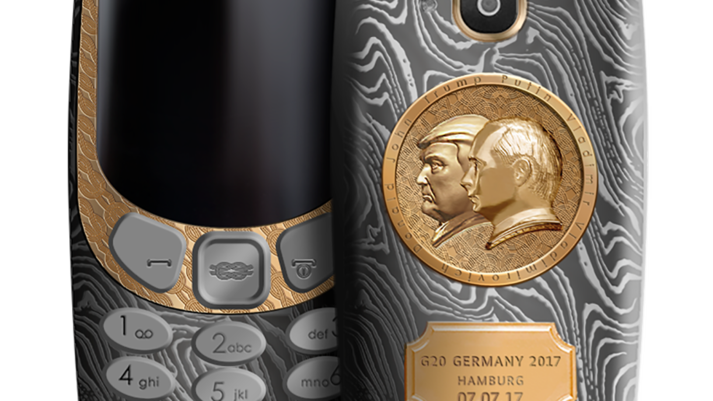 На тыльной стороне телефона изображен силуэт Кремля, на которым размещается гравировка с гербом России и портрет российского президента с надписью The Golden Age of Vladimir Putin, обозначающей «время рассвета страны под руководством Путина».