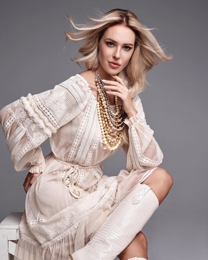 В фотосессии Карина Жосан сменила три лука: красавица позирует в двух вечерних платьях, уникальной бриллиантовой короне с топазами, дизайнерских ювелирных украшениях и в нежном платье-вышиванке.