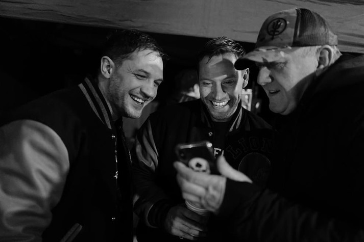 Стильные фотографии в черно-белом цвете показывают, как персонаж Эдди Брок под дождем идет на камеру, а также есть фото где актеры уже стоят рядом, при этом Харди смеется. А вот Харрельсону, который исполняет роль главного антагониста по имени Клетус Кэсэди, не особенно весело.