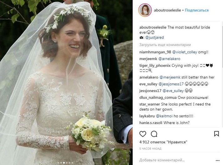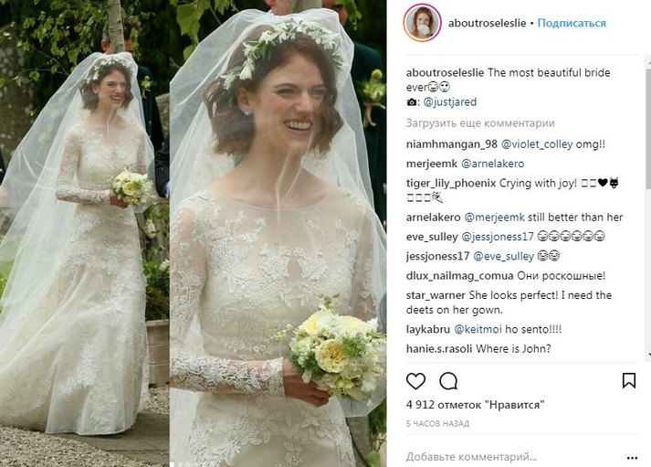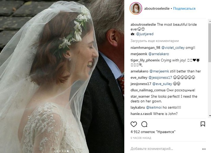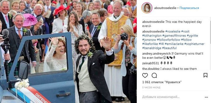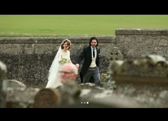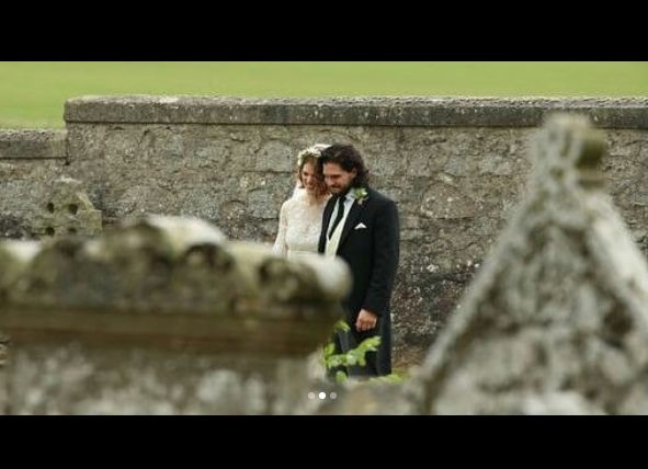 Кит Харингтон был одет в класcический костюм-тройку, а Роуз Лесли была невероятном кружевном свадебном платье с длинной фатой.