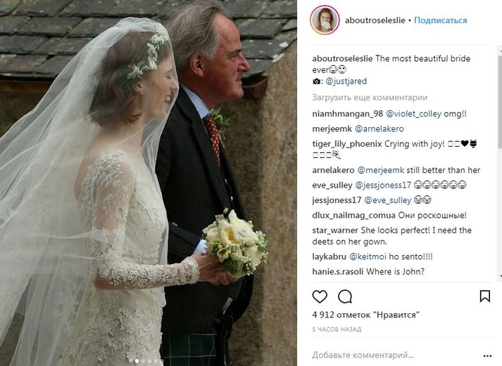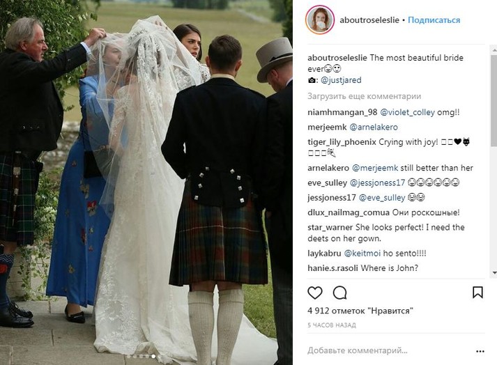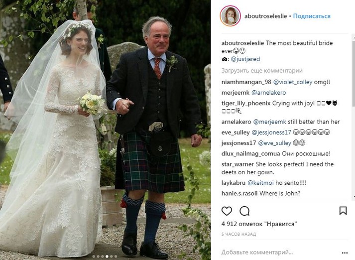 В руки супруга, ожидавшего невесту у алтаря, Лесли передал ее отец. Он, кстати, был одет на шотландский манер - брюкам предпочел килт. После торжественной церемонии молодоженов осыпали рисом и лепестками роз.