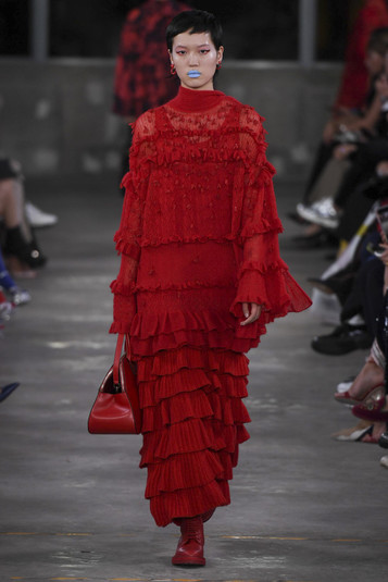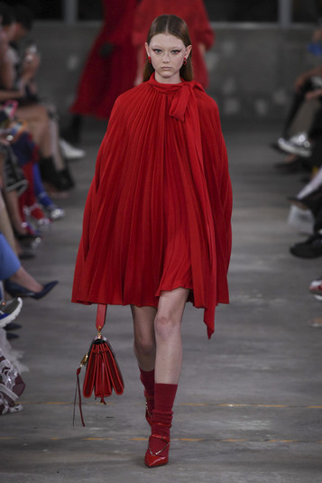 Основой этого мира, естественно, стал красный цвет. Он является визитной карточкой бренда и при этом занимает важное место в японской культуре. Пылающие, как восходящее над Фудзиямой солнце, образы открыли шоу и закрыли его. Начал Пиччолли со свободных платьев, не сковывающих движений, которые были «отягощены» плиссировкой, складками и оборками, сложенными на манер «оригами».